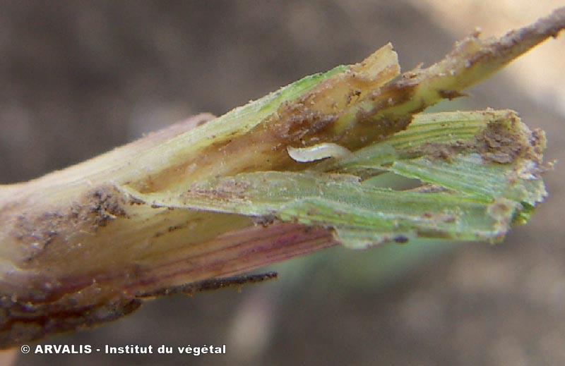 Les oscinies sont des petites mouches qui vont pondre sur des maïs du stade 1 feuille au stade 4 feuilles, dans les gaines des jeunes feuilles. Les larves issues des œufs vont intoxiquer la plante. Lorsque la pénétration de la larve est profonde, l’apex peut être bloqué dans son développement. La plante réagit en tallant. Les larves d’un aspect jaune clair, mesurent 4 mm en fin de développement. Elles sont difficiles à détecter car les symptômes apparaissent sur la plante plusieurs jours après que la larve ait attaqué.