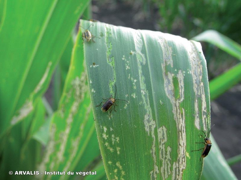 - avant le stade floraison, les adultes se nourrissent de la cuticule des feuilles. Ensuite, ils se nourissent des soies, de pollen, voire des grains au sommet de l'épi. On peut observer des bandes plus ou moins larges décolorées sur les limbes des feuillles, des soies coupées, des grains creusés.