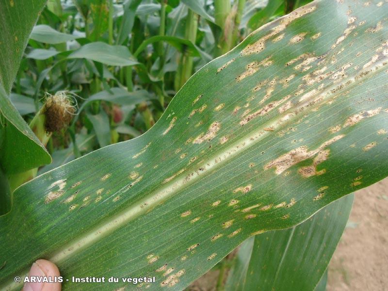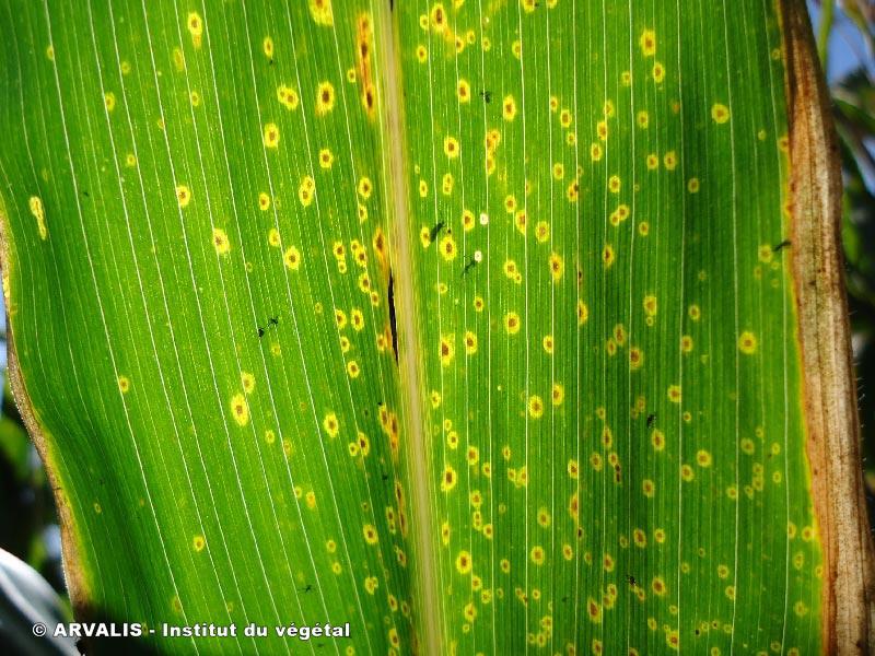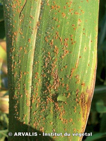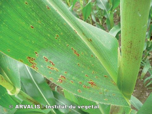 Les pustules brun orangé dispersées sur les feuilles médianes sont caractéristiques. Elles évoluent vers une coloration marron foncée à noire lors de la maturation du maïs.