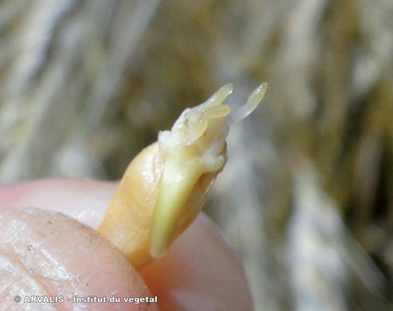 | Titre : Grains germés sur épis Description : Une fois la dormance levée, le grain germe et le coléoptile apparaît. |