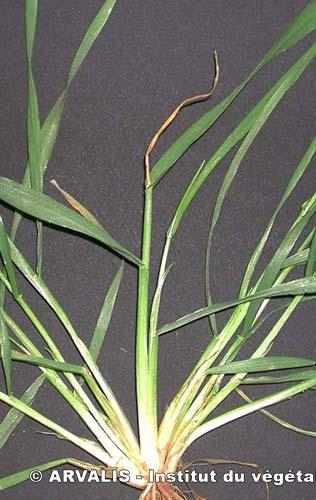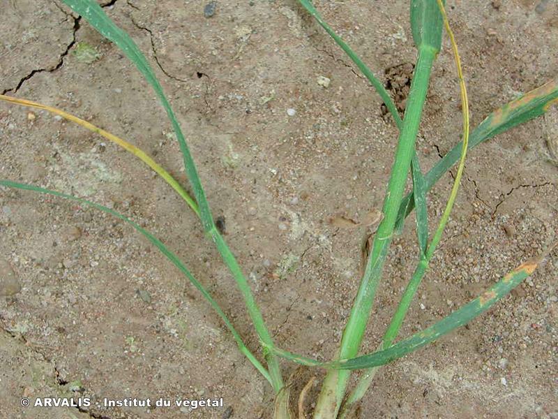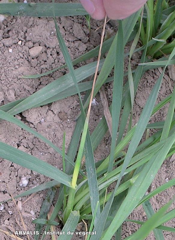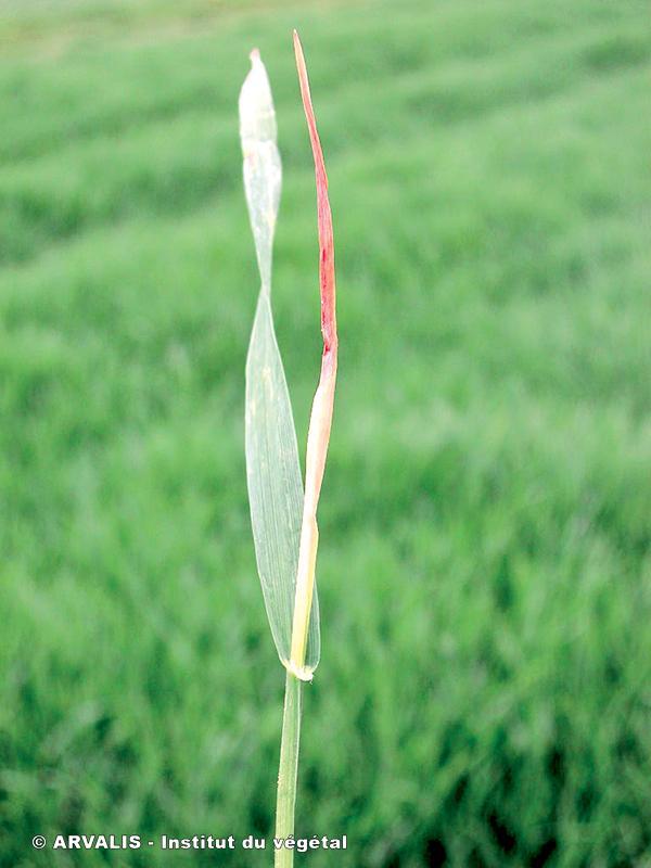 - L’épi est détruit et devient marron (comme un dégât de gel), et la dernière feuille jaunit.