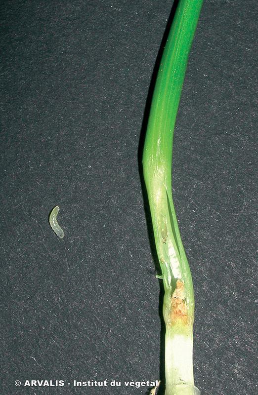L’asticot s’introduit entre les feuilles à la sortie de l’hiver, puis descend en dévorant la tige et consommant le jeune épi. Les attaques se limitent généralement à la destruction de quelques talles, sans conséquence pour le rendement.