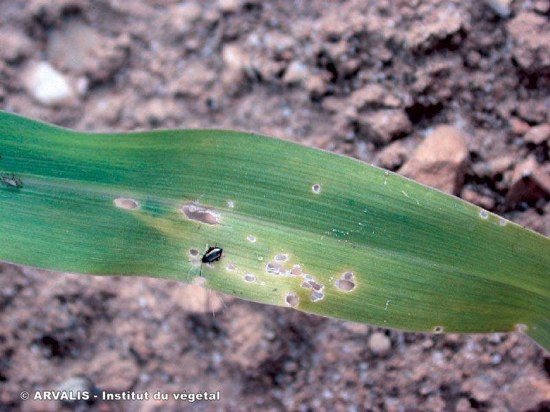 Perforations et décapages sur les plantules de maïs de 2-3 feuilles dont la croissance et le développement sont ralentis par un temps froid.