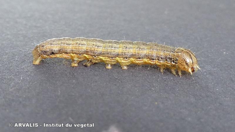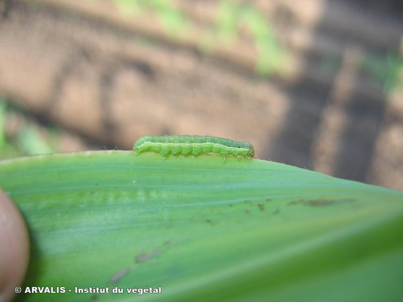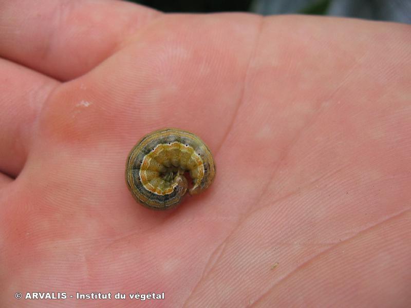 Les chenilles mesurent 40 à 45 mm à complet développement. Elles sont généralement de couleur vert amande claire, mais parfois vert foncé, presque noir. Elles comportent dorsalement six lignes fines blanchâtres ainsi qu'une bande jaunâtre sur le côté. Sa tête est petite et le tiers antérieur du corps est étroit. Elle n'a que deux paires de fausses-pattes abdominales et se déplace en arpenteuse, deux caractéristiques spécifiques à cette noctuelle susceptible d'occasionner des dégâts sur maïs.