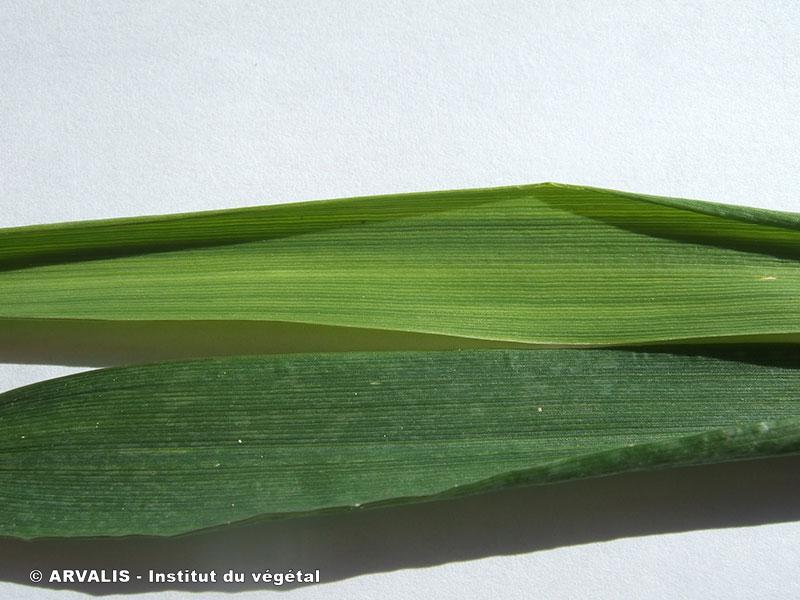 | Titre : Jeunes feuilles vert pâle. Description : Décoloration vert clair à jaune des jeunes feuilles (feuille supérieure blé). |