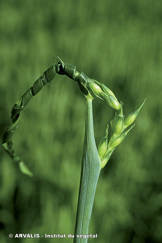 | Titre : Difficulté de sortie des épis Description : Epiaison difficile avec enroulement de la dernière feuille. |