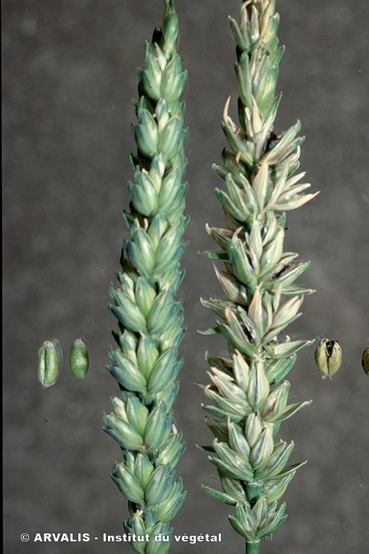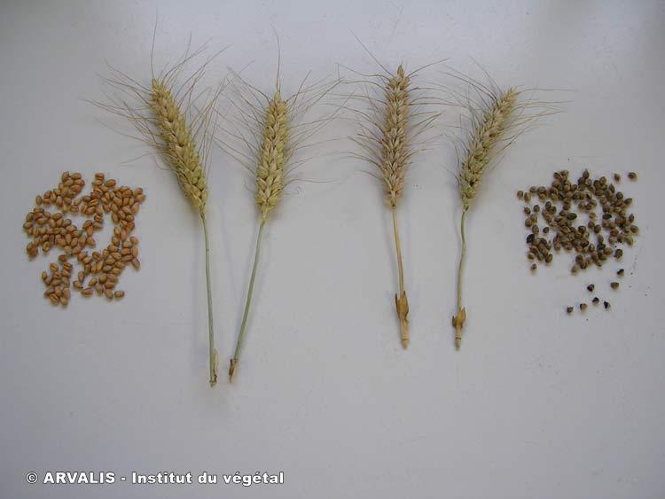 - Les épis cariés sont plus petits et de couleur bleutée par rapport aux épis sains.