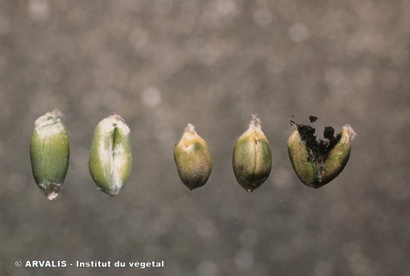 Les spores sont présentes, soit à la surface du grain (au niveau de la brosse et du sillon), soit dans le sol. Le mycélium pénètre alors le coléoptile (avant le stade 2 feuilles), contamine la plantule puis progresse sans symptôme à l’intérieur de la plante.