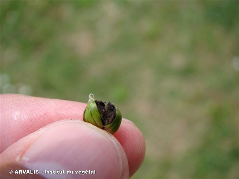 - Couleur vert foncé des glumes et glumelles. Le champignon se développe dans les grains, en respectant les téguments. Les grains cariés sont remplis de spores de coloration noire, qui ont pris la place de l’amidon.