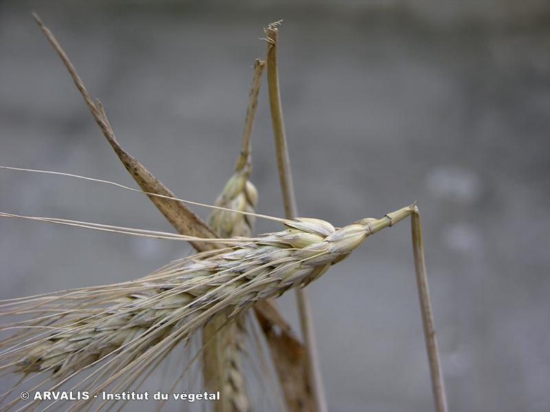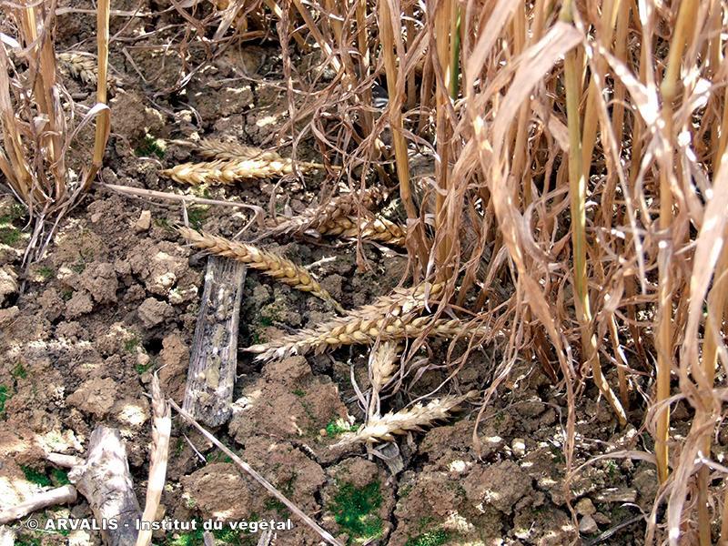 - Présence d’épis blancs «la tête en bas» ne tenant plus que par une fibre. Une période venteuse avant la récolte peut en faire tomber une grande partie. On retrouve alors des épis cassés, jonchant le sol.