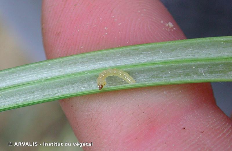 - Larve de couleur jaunâtre et longue de 10 à 13 mm à son complet développement. Elle est présente dans le bas des chaumes à la moisson.