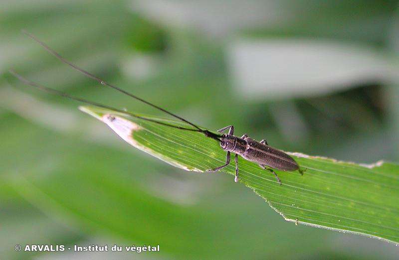 - Adulte : son corps est cylindrique, très étroit, entièrement de couleur noire peu brillante. Il possède 2 longues antennes. Sa taille est proche d’1 cm. Il émerge en avril et se nourrit à l’extrémité des feuilles.