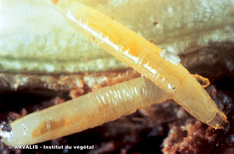 • Présence d’un asticot blanchâtre (5 mm environ à son complet développement) à la base de la plante. Il présente 2 protubérances sur le dernier segment.