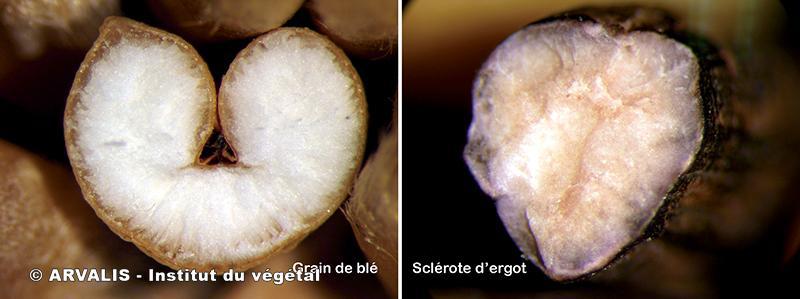 | Titre : Coupes d'un grain de blé tendre et d'un sclérote d'ergot Description : Coupe d'un grain de blé tendre (à gauche). Coupe de sclérote d'ergot : extérieur noir, section blanc violacé (à droite). |
