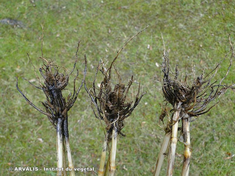 - Racines : nécroses noires parfois étendues à toute la racine.