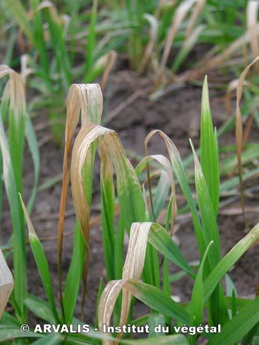 - De la levée à fin tallage : les feuilles et les gaines deviennent rougeâtres en cas de froid modéré. En cas de froid important, les plantes jaunissent, se desséchent. Elles ont un port flasque voire couché au sol, puis meurent.