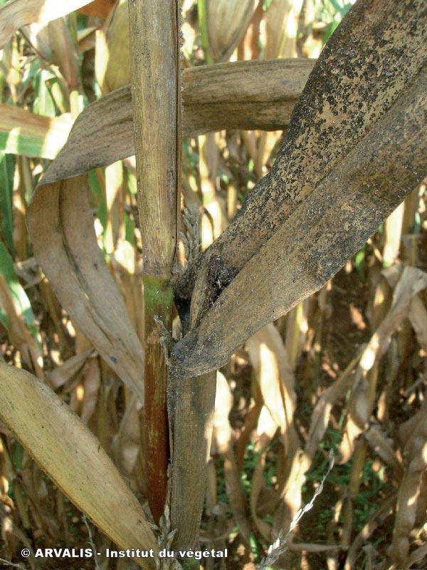 | Titre : Puceron noir Ropalosiphum padi Description : Les feuilles situées au-dessus de l'épi sont recouvertes par le miellat alors que l'épi commence à sortir ses soies. |