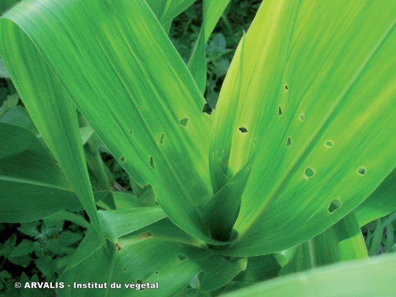 | Titre : Pyrale Description : Perforation des feuilles en « coup de fusil » par les jeunes larves de pyrale à la recherche de la panicule. |