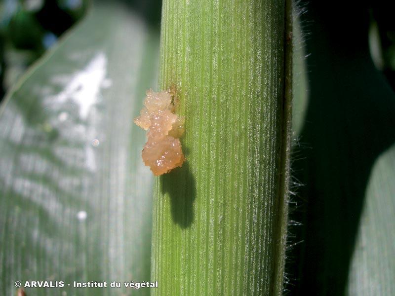 | Titre : Pyrale Description : Exsudat au niveau du trou qui signe l'entrée des larves de pyrale dans la tige. |