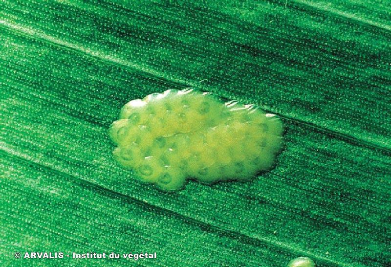 | Titre : Pyrale Description : Les oeufs sont déposés par plaque de 20 ou 30, le plus souvent sur la face inférieure des feuilles. |